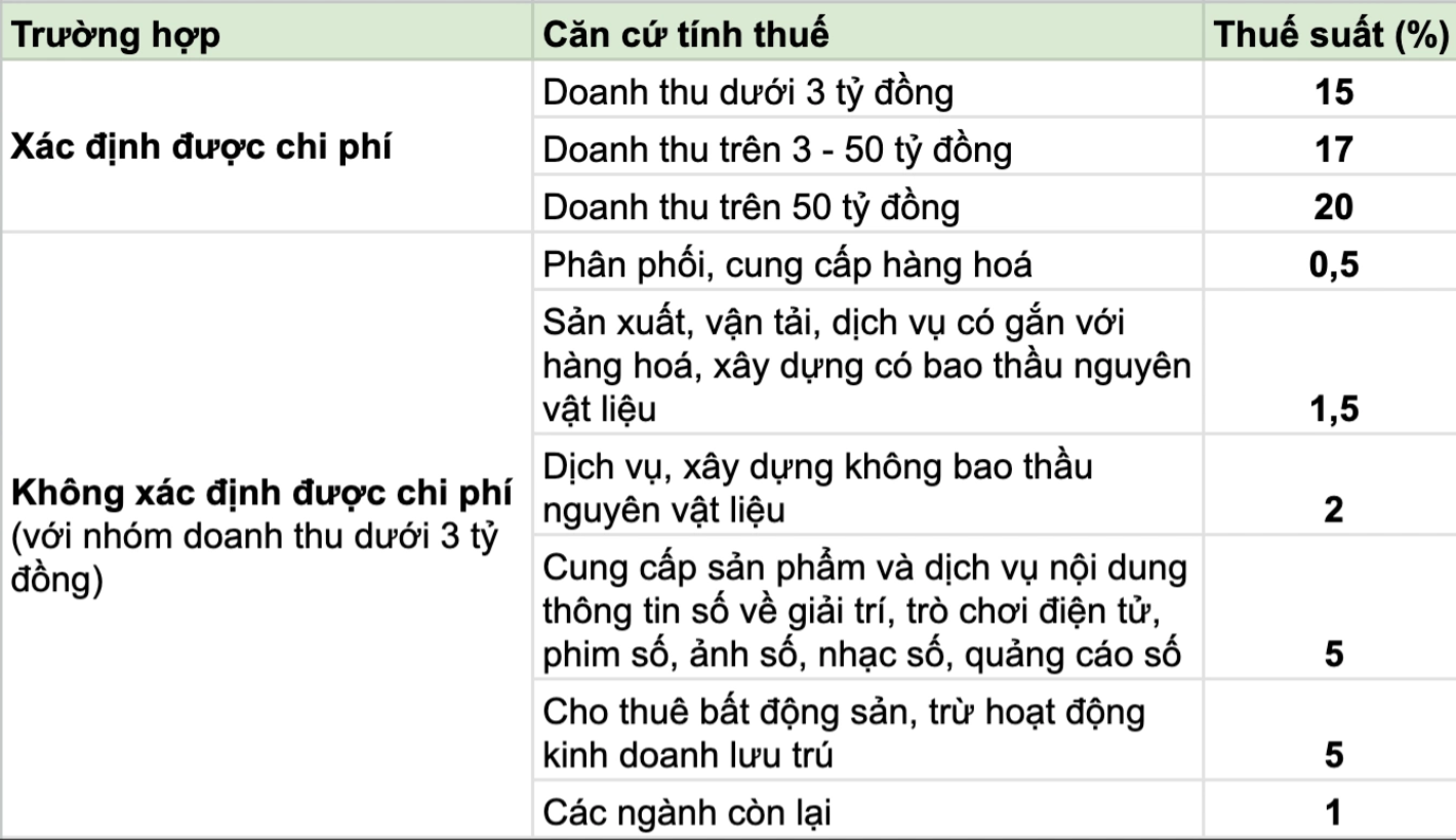 Luật cũng bổ sung cách tính thuế trên lợi nhuận (chênh lệch doanh thu và chi phí) với các hộ kinh doanh. Cụ thể, hộ có doanh thu dưới 3 tỷ đồng một năm nếu xác định được chi phí đầu vào sẽ chịu thuế suất 15% trên phần lãi. Mức này tương ứng ưu đãi thuế suất thu nhập doanh nghiệp của công ty siêu nhỏ có doanh thu tương đương.